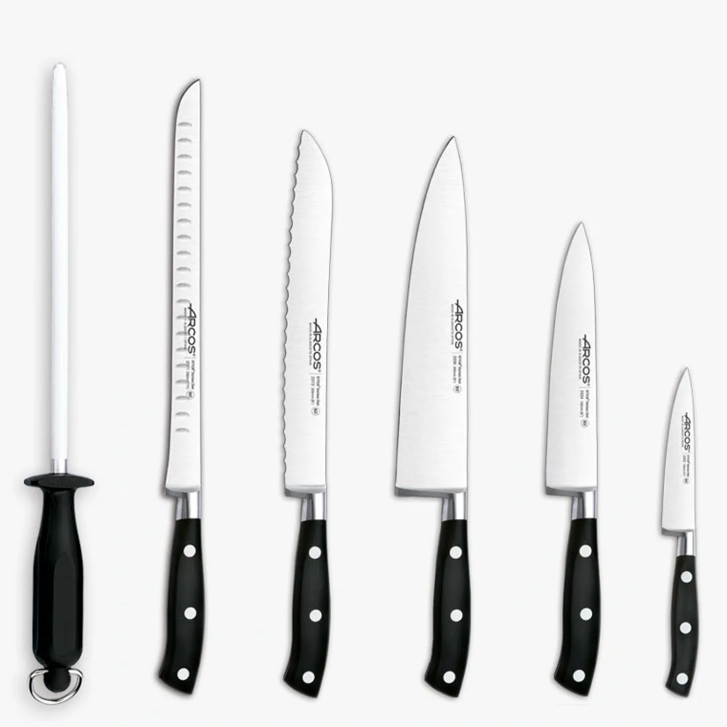 Le bloc garni de couteaux de cuisine Série Riviera 5 pièces avec fusil inclus comprend 4 couteaux Riviera et un fusil pour aiguiser fabriqués par Arcos, un spécialiste espagnol.