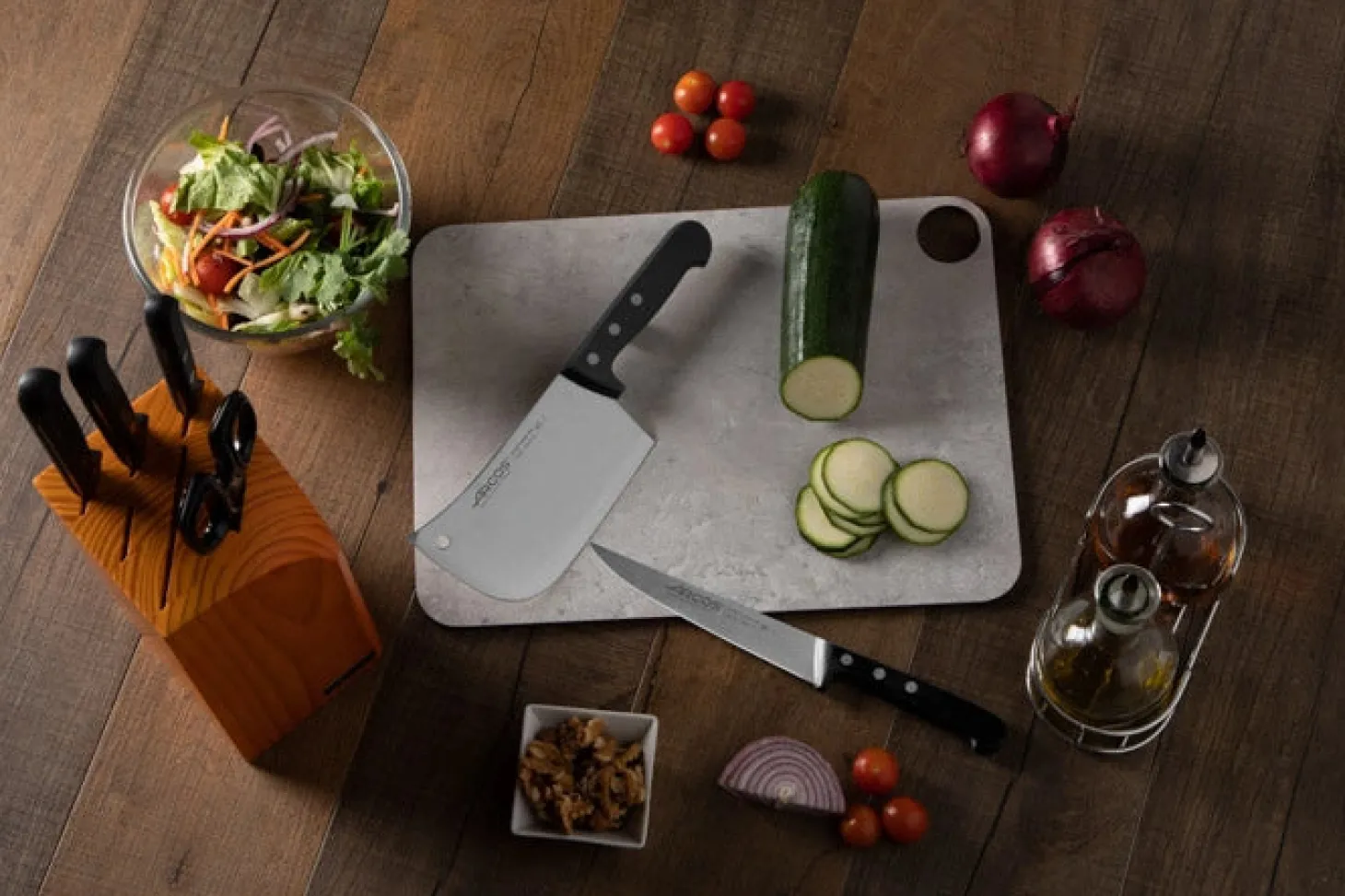 Ce bloc garini de couteaux de cuisine Arcos de la gamme Universal est l’équipement parfait dont vous avez besoin pour toutes vos préparations ! Couper des légumes, du pain et du jambon, organisé dans un bloc en bois de pin.