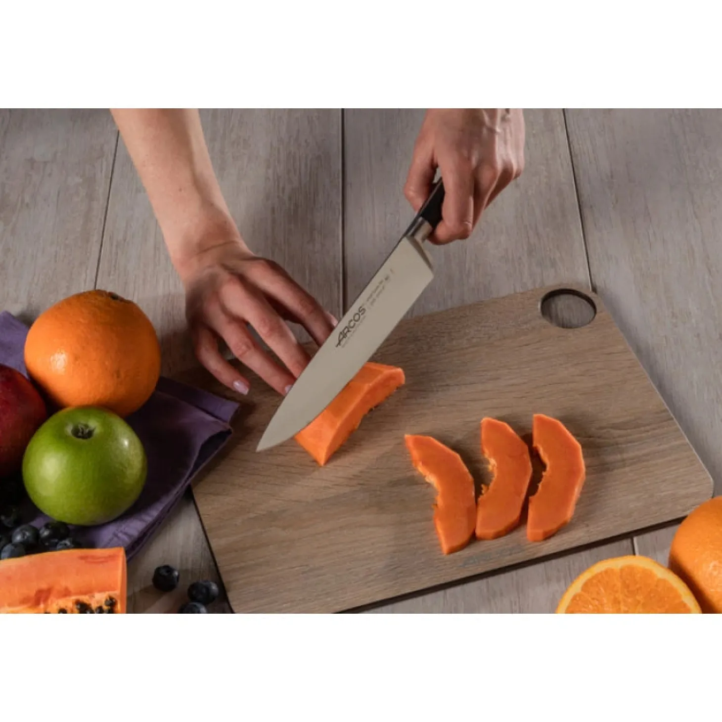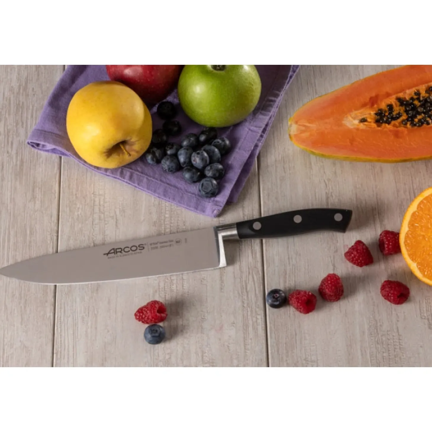 - Lame en acier inoxydable NITRUM®, un matériau breveté par Arcos qui garantit une bonne coupe.