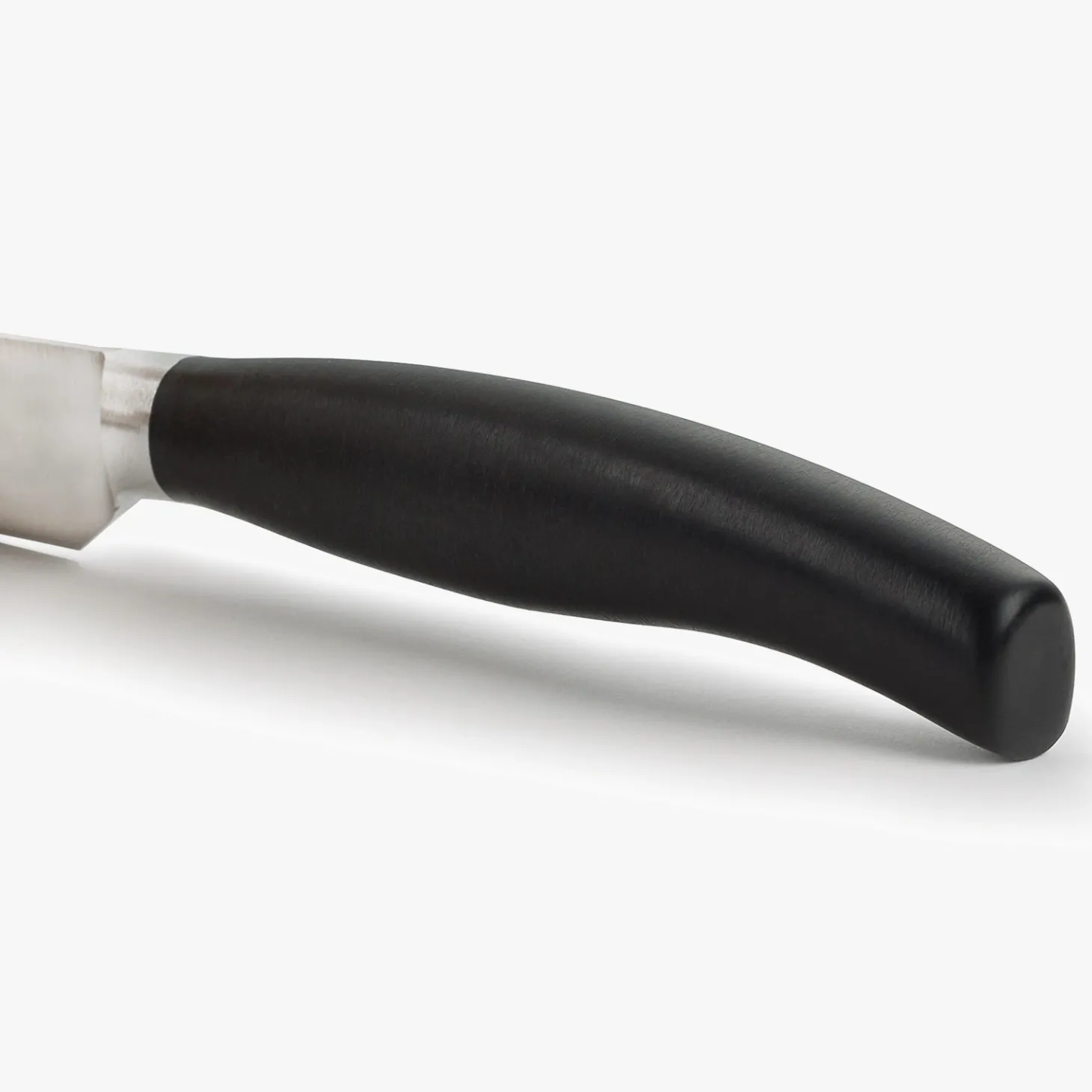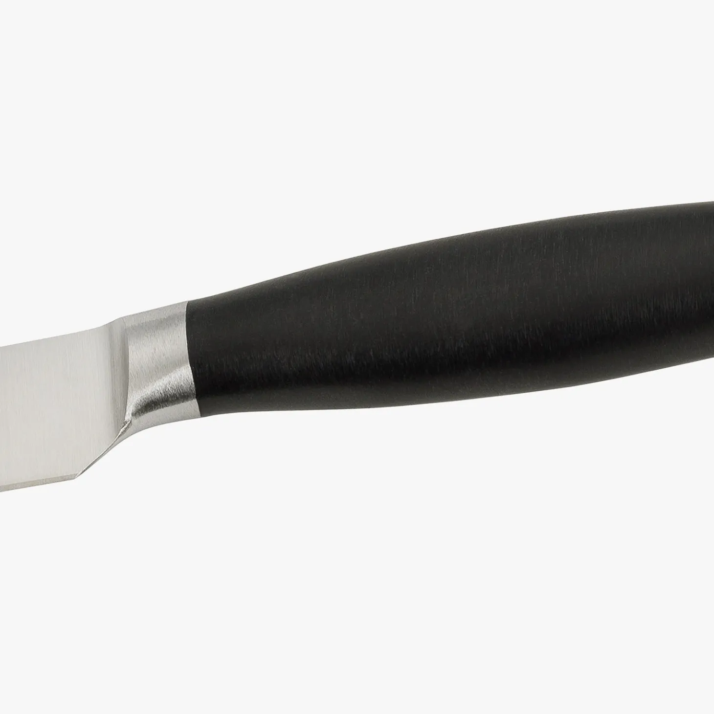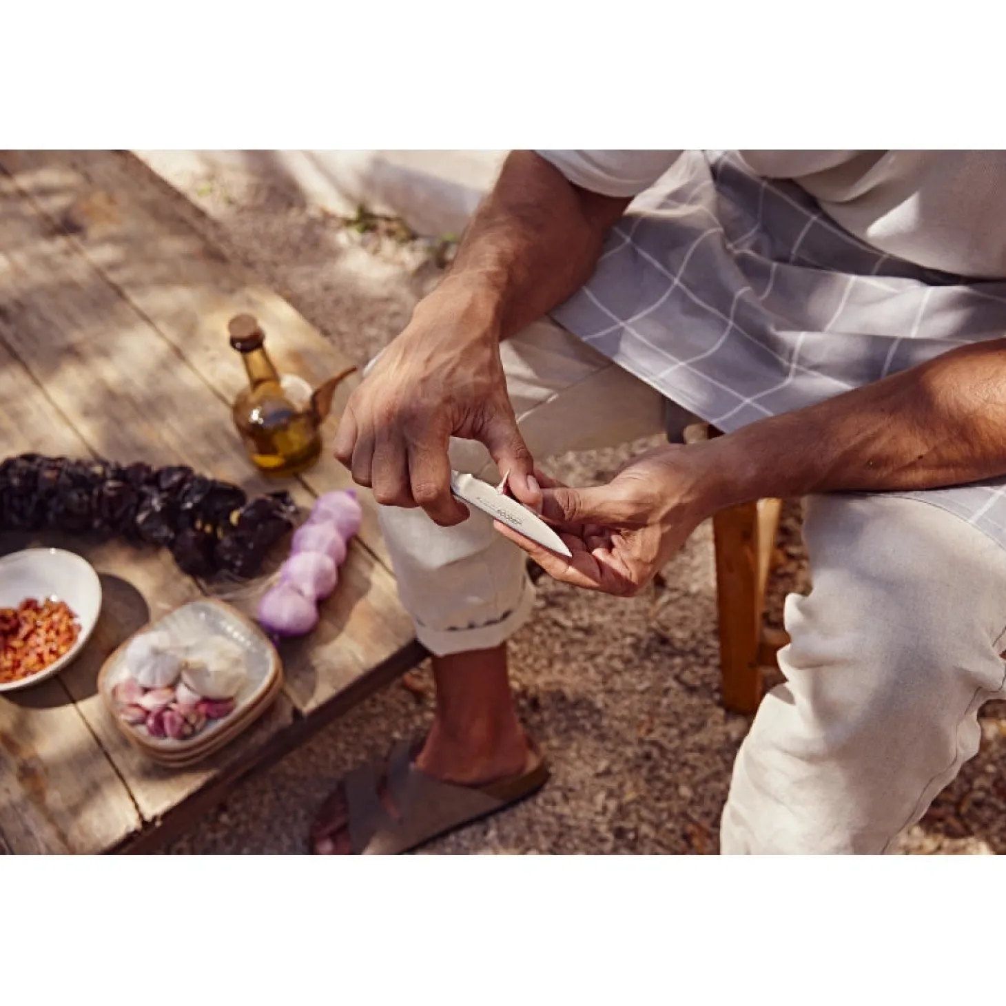 Couteau légumes de 130 mm, forgé d’une seule pièce, sans aucune soudure. Composé d’acier NITRUM, notre formule d’acier à l’azote, il donne à la lame une plus grande dureté, un plus grand pouvoir de coupe et une meilleure durabilité du fil, réduisant et facilitant l’entretien