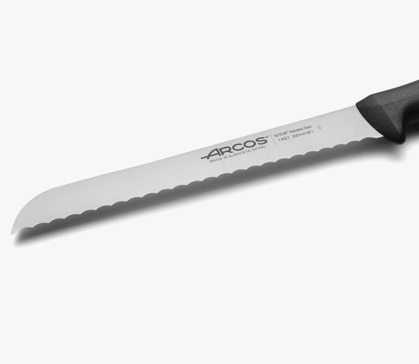 Lame longue forte et crantée. Avec des dents que coupent la croûte du pain.