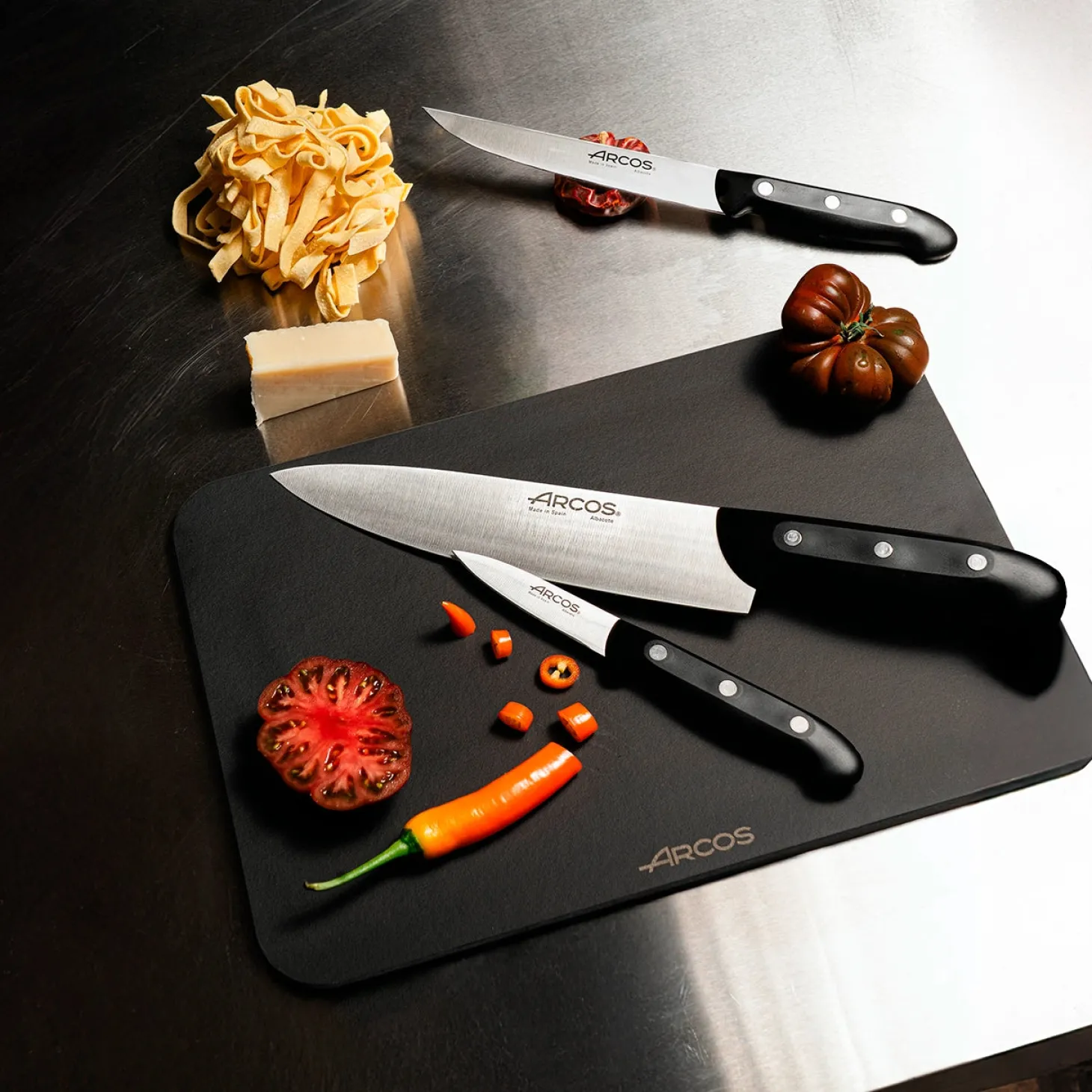 Le Set de 3 couteaux Maestro de Arcos comprend un couteau d’office de 80 mm, un couteau de cuisine de 150 mm et un couteau de chef de 215 mm, idéals pour nettoyer, peler et couper une grande variété de fruits, légumes et autres types d’aliments.