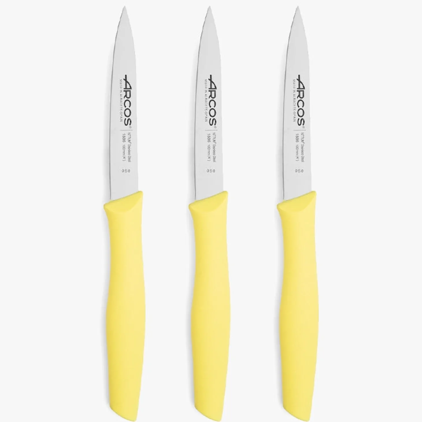 Set de 3 couteaux d’office de la série Nova avec des lames en acier inoxydable NITRUM de 100 mm et un manche ergonomique couleur citron. Série Nova de Arcos.
