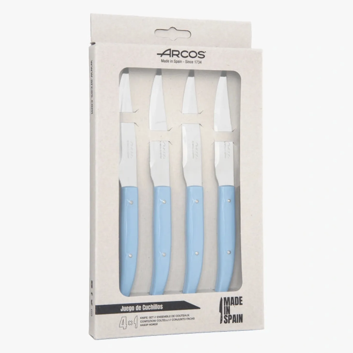 Jeu de 4 couteaux à steak de 110 mm avec manche bleu ciel, idéal pour les coupes puissantes et précises de pièces du boucher, entrecôte ou steak végétarien.