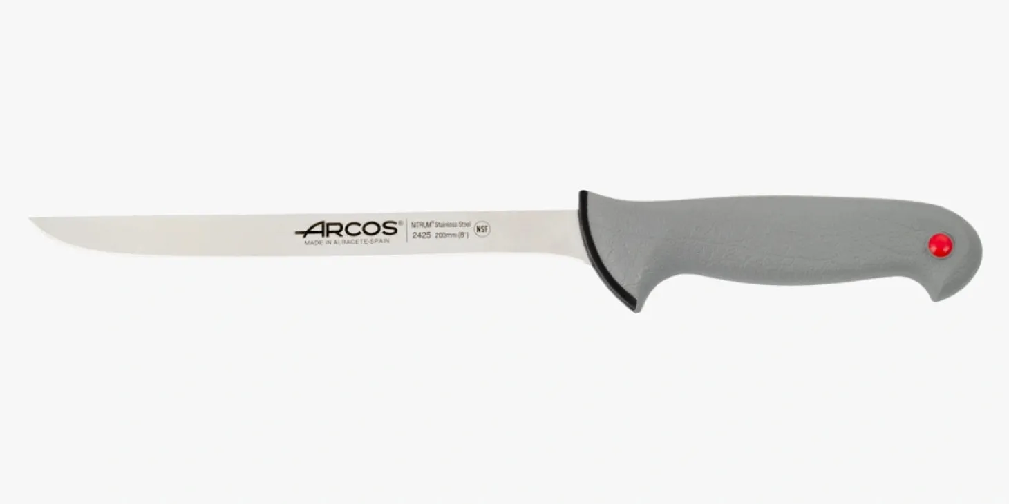 D’une lame longue, fine et flexible, avec un tranchant lisse, le couteau à filets permet de fileter viandes et poissons, obtenant ainsi une coupe nette. Le manche de chaque couteau indique le type d’aliments auquel il est destiné, grâce à des bouchons en polypropylène de différentes couleurs. Conçus dans le but d’assurer un contrôle hygiénique et sanitaire parfait.