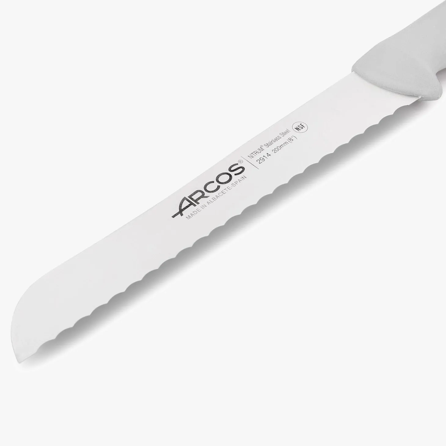 Lame longue forte et crantée. Avec des dents que coupent la croûte du pain.