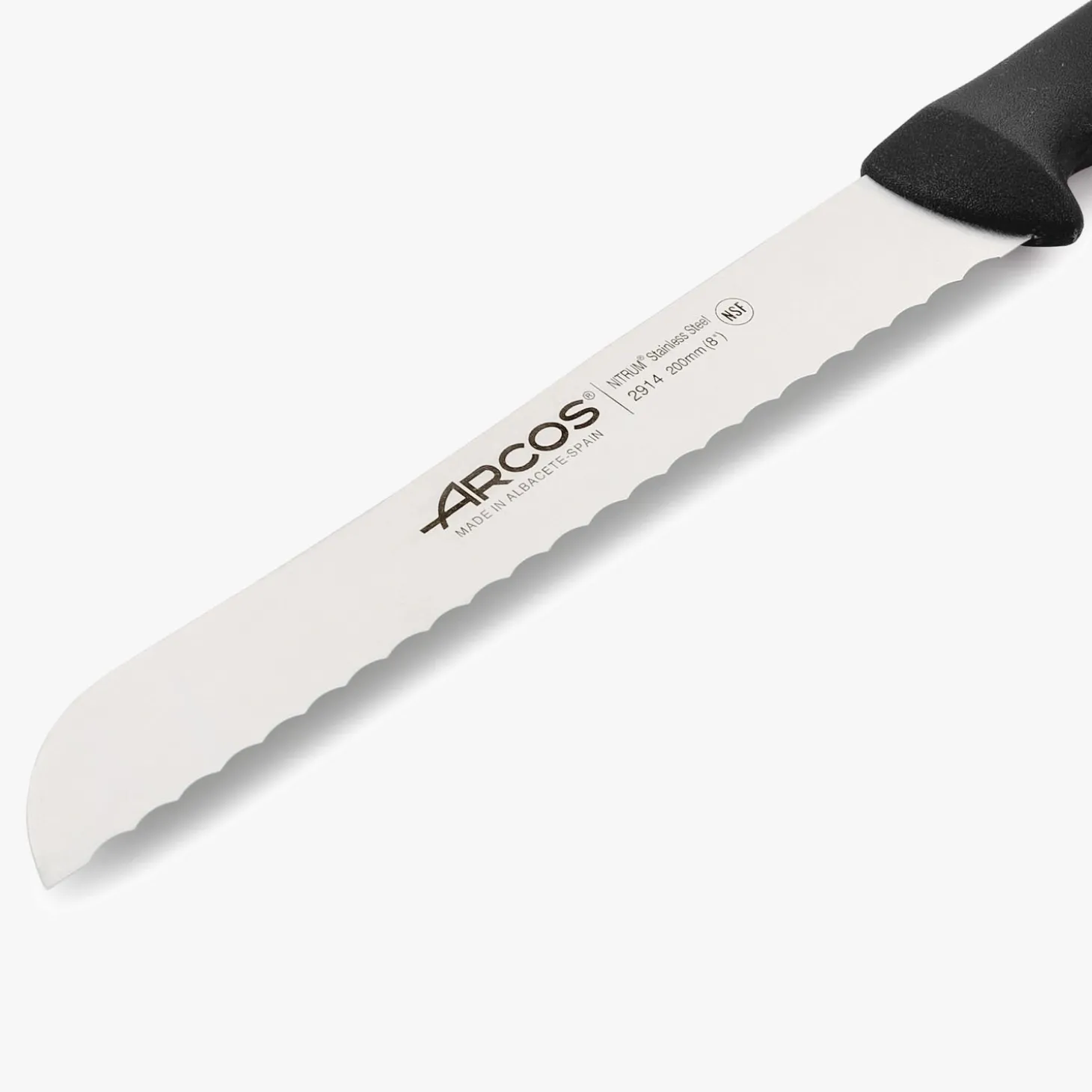 Lame longue forte et crantée. Avec des dents que coupent la croûte du pain.