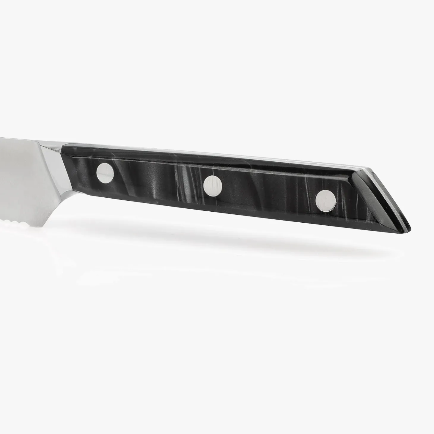 - Manche en acrylique noir nacré : Un toucher élégant, avec des motifs exclusifs qui rendent chaque couteau unique.
