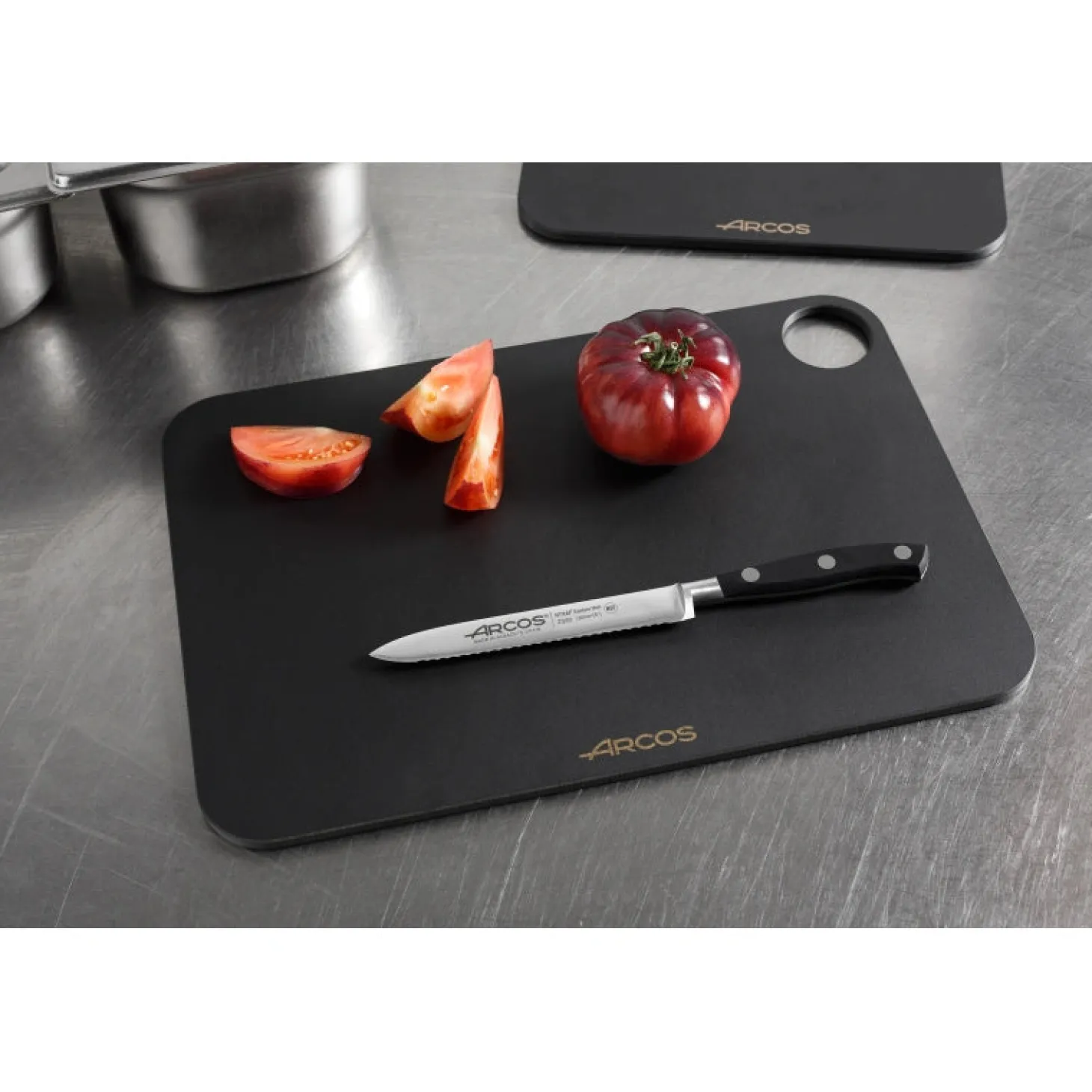 Le couteau à tomates de la série Riviera de 130 mm avec manche noir a été fabriqué par Arcos et est utilisé pour couper des tomates, des morceaux de pain ou de gâteaux.
