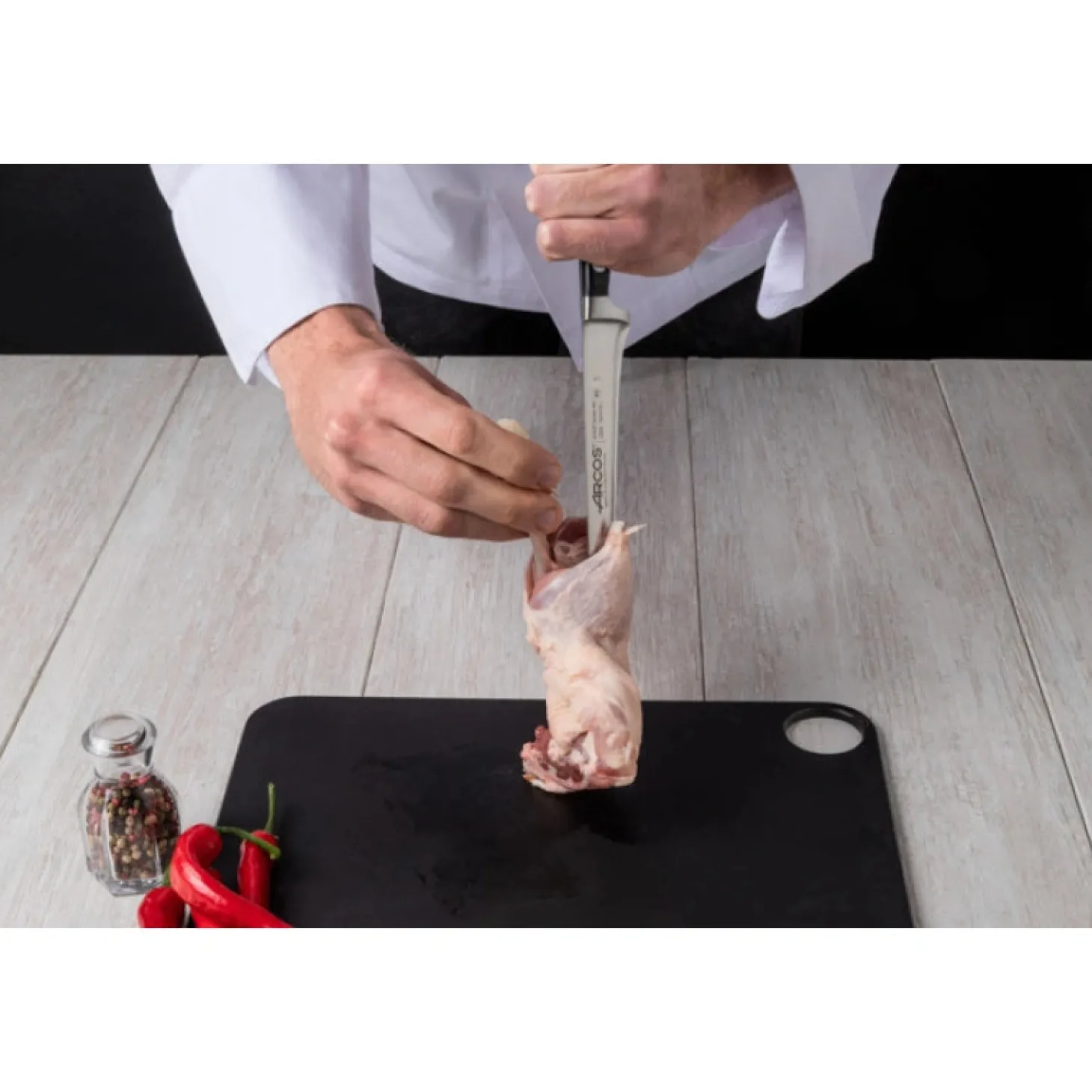 Lame fine avec une courbe caractéristique et un fil lisse. Parfait pour separer la viande de l´os.
