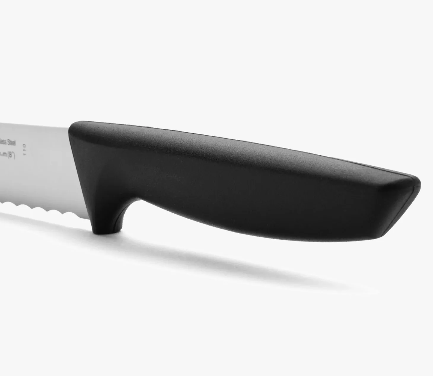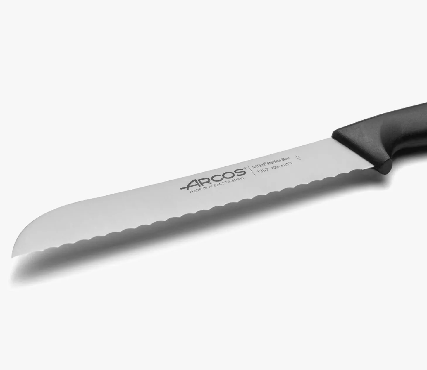 Lame longue forte et crantée. Avec des dents que coupent la croûte du pain.