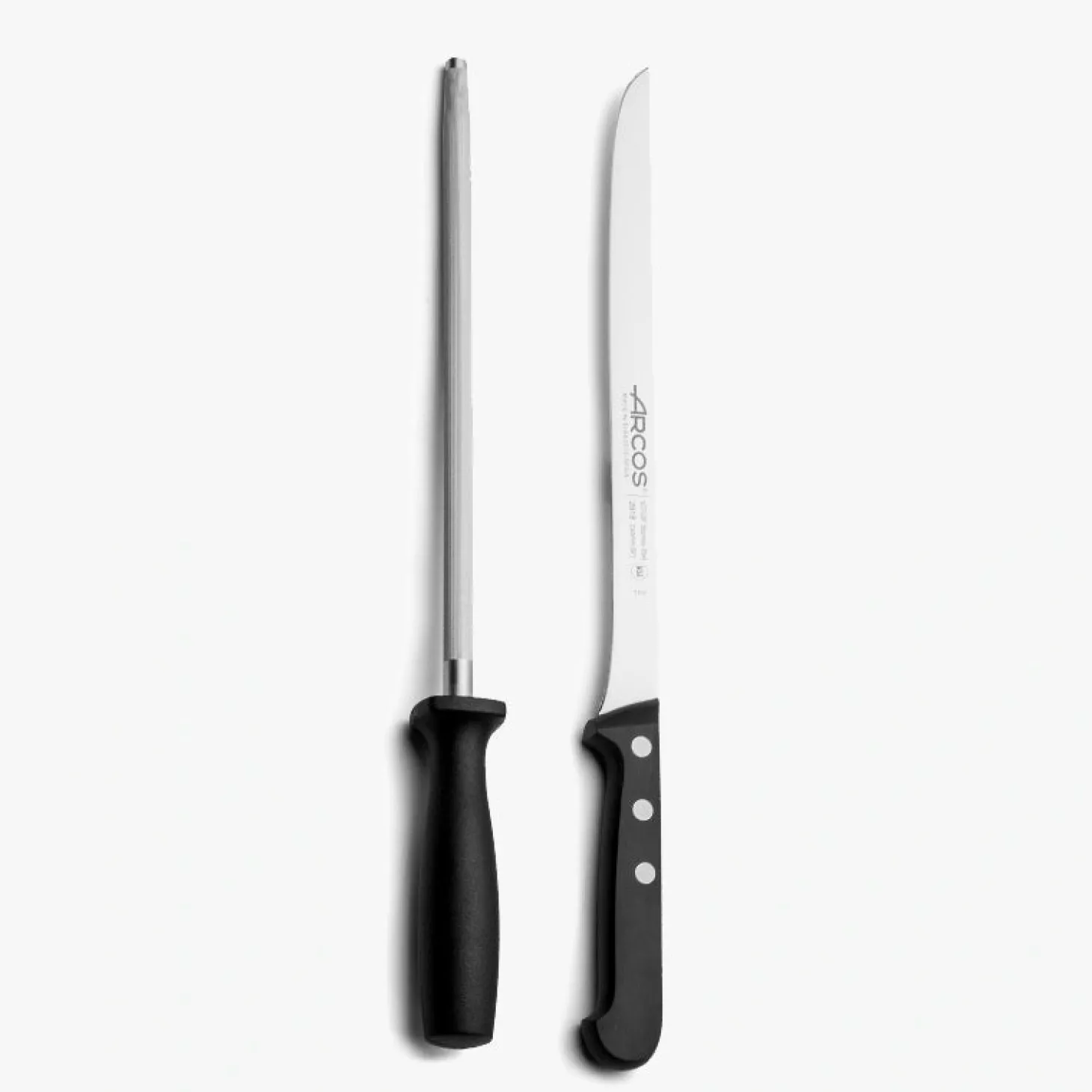 Le Set Jamonero Serie Universal comprend un couteau à jambon de 240 mm et une fusil de 230 mm, tous deux en acier inoxydable.