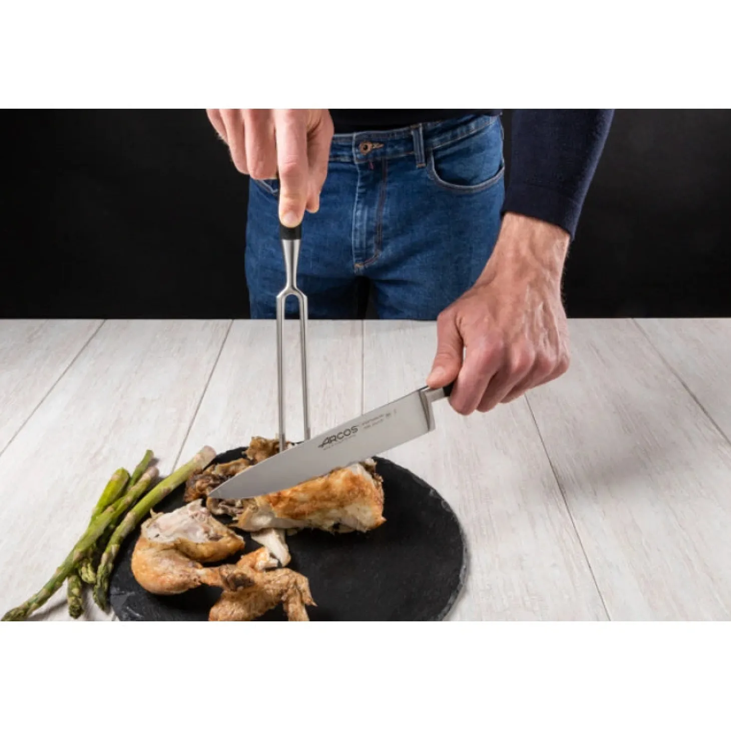 Fourchette utilisée pour tailler toutes sortes de viandes rôties à l’aide d’un couteau à découper. Il se caractérise par deux pointes allongées.