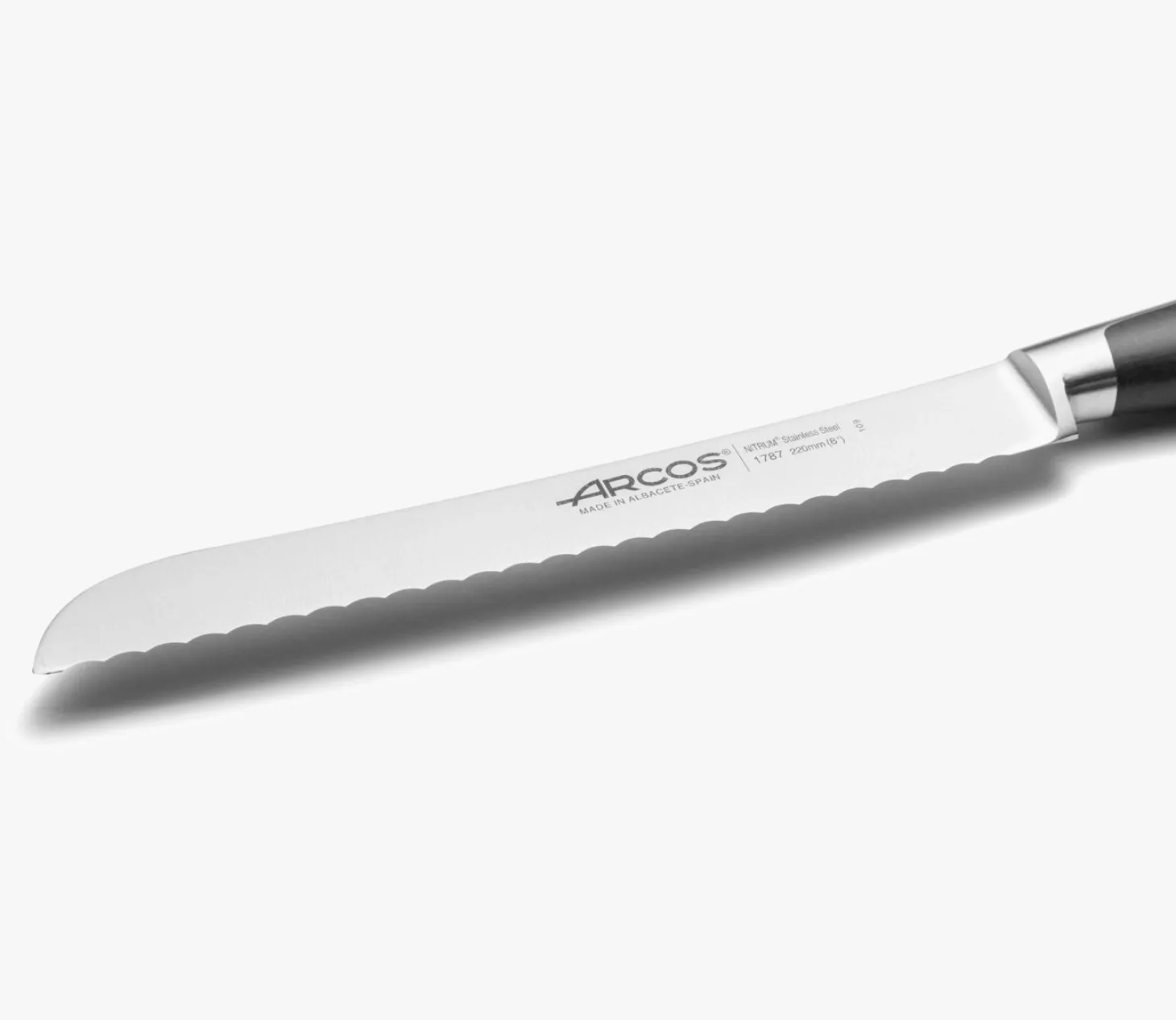 Lame longue forte et crantée. Avec des dents que coupent la croûte du pain.
