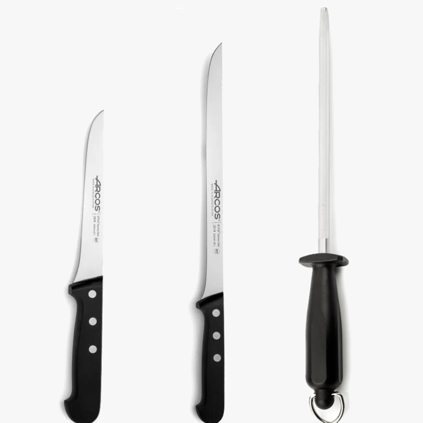 Ensemble de couteaux pour déguster le jambon de la gamme Arcos Universal. Comprend deux couteaux et un fusil à aiguiser.
